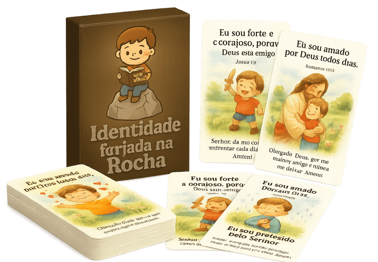 São cartinhas ilustradas com frases bíblicas positivas, versículos e pequenas orações, criadas para fortalecer a identidade cristã das crianças e cultivar momentos de fé em família.